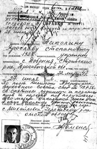 | Справка об освобождении Ярослава Николина, выданная ему 27 июля 1956 года |