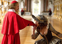 Оказывается, французская королева герцогу даром не нужна, ему нужна война между Англией и Францией. Того же добивается кардинал Ришелье (Кристоф Вальц, он же фашист Ланда в «Бесславных ублюдках» Тарантино), который хочет скомпрометировать и отправить на эшафот королеву, свергнуть молодого глупого короля и править единолично. Если повезет - не только Францией, но и Англией. Голос за кадром убеждает, что помешать злодеям могут лишь те, кому неведом страх, то бишь мушкетеры - Атос, Портос и Арамис.
