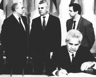 | С Михаилом Горбачевым, председателем Верховной Рады Украины Леонидом Кравчуком и первым заместителем председателя Верховного Совета РСФСР Русланом Хасбулатовым. «Говорили, что Украина отказалась подписывать Союзный договор...». — «Это не так. У меня есть фотография, на которой видно, как я ставлю свою подпись» |