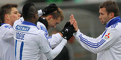 | Автор гола Андрей Ярмоленко, Андрей Шевченко, Браун Идейе и Огнен Вукоевич во время матча «Динамо» (Киев) — «Оболонь» 18-го чемпионата Украины по футболу, 26 ноября 2011 года Фото УНИАН |