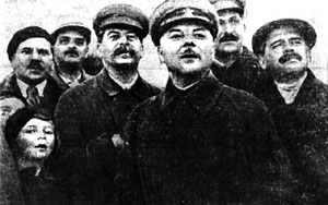 | Парад в подмосковном Тушино. Александр Аросев с дочерьми (впереди Оля), Лазарь Каганович, Иосиф Сталин, Клим Ворошилов и другие, 12 июня 1935 года. «Как не стыдно, — сказал Сталин, — большие встали, а маленьким детям ничего не видно» |