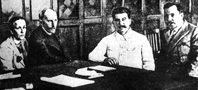 | Французский писатель Ромен Роллан с женой, Иосиф Сталин и Александр Аросев, 1935 год. «Роллан был тусклый сгорбленный старик, больной туберкулезом. Глаза, правда, очень живые...» |