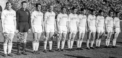 | Сборная СССР: Альберт Шестернев, Лев Яшин, Валерий Воронин, Эдуард Стрельцов, Александр Ленев, Валентин Афонин, Иосиф Сабо, Анатолий Бышовец, Федор Медвидь, Василий Данилов и Игорь Численко, 1967 год Фото «РИА Новости» |
