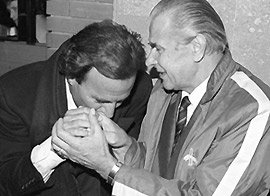 | 1989 год, Хулио Иглесиас целует руку Льву Яшину. Известный испанский певец в молодости был вратарем клуба «Реал Мадрид» |