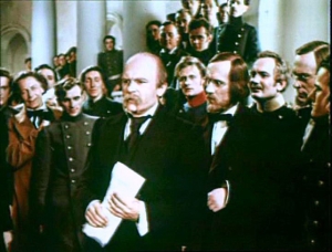 — Наверное, передать дух времени — воссоздать историческую обстановку полувековой давности. Нам помогали исторические музеи со всей страны — без них сделать такую картину было бы невозможно. Так, маленькая шкатулка, которую во время совета в Филях держит в руках Барклай де Толли, — из экспозиции Музея Кремля. В течение всей сцены ее не использовали, оператор отснял руку актера на шкатулке, после чего ее завернули в ту же ткань, в которой принесли, и с благодарностями вернули обратно. Шаль, которую зрители видят на Ахросимовой, привезли из Эрмитажа. Правда, в экспозиции ее, побитую молью, уже не выставляли, в кадре же дырочек не было видно, зато она создавала атмосферу начала XIX века.