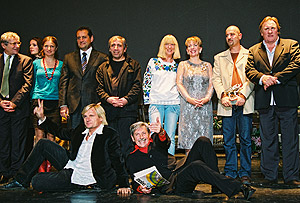 ![]() Члены международного жюри, супруга Президента Екатерина Ющенко, обладатель Гран-при «Молодости» израильтянин Эран Колирин со «Скифским оленем» и Жерар Депардье. На переднем плане — лидер ВВ Олег Скрипка и художественный руководитель кинофестиваля Андрей Халпахчи |