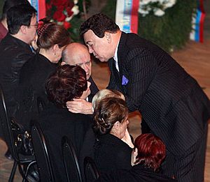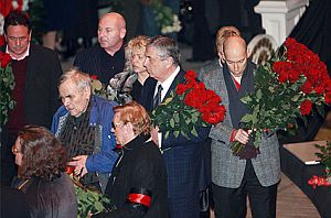 ![]() Тамара Синявская настояла, чтобы мужа похоронили в родном Баку по мусульманским обычаям ![]() «Каждый из нас чувствует сегодня свою вину перед Муслимом, — сказал Иосиф Кобзон. — Мы знали, что он тяжело болен и страдает, но ничего не сделали, чтобы продлить его жизнь. Теперь Муслим ушел навсегда, но оставил нам великое наследство — свои записи...» ![]() Проводить Муслима Магомаева пришли тысячи поклонников. В конце траурной церемонии после трансляции песни «Мелодия» публика в течение 10 минут по традиции прощалась с любимым певцом аплодисментами. На снимке: Александр Градский, Ренат Ибрагимов, Роман Виктюк, Олег Сосковец, Дмитрий Гордон и другие |