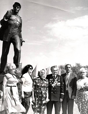 | Открытие памятника Алексею Стаханову в городе Стаханове. Слева направо: Людмила — супруга сына Стаханова от первого брака Виктора, дочь от первого брака Клавдия, дочь от второго брака Виолетта, младшая сестра Алексея Григорьевича Полина, бывший парторг шахты «Центральная-Ирмино» Константин Петров, сын Виктор, внучка Наталья |