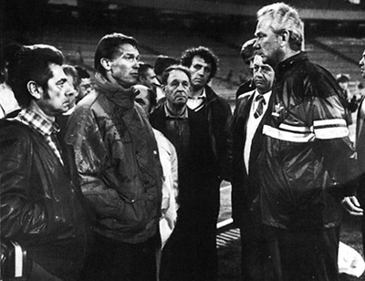 | Дэви Аркадьев, Олег Блохин, Валерий Лобановский и другие накануне прощального матча Олега. Киев, 1988 год |