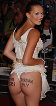 На днях мисс Кларксон решила подпортить нервы своей коллеге - топ-модели Джоди Джордан. Люси попросила друга написать на ее обнаженных ягодицах крупными буквами: "Джоди Джордан, поцелуй мою...", надела самую короткую юбку из имеющихся и отправилась в ночной клуб. Там при большом скоплении народа Кларксон задрала юбочку (она все же решила надеть трусики-танго, которые, впрочем, ничего не скрывали) и продемонстрировала фотографам и всем любознательным тусовщикам свое отношение к сопернице.