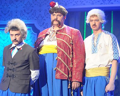 | Трое казаков — Владимир Зеленский, Юрий Корявченков и Евгений Кошевой — в поисках водки «з бульбашками» добрались до Екатерины II |