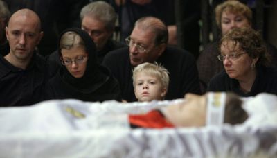 | Гражданская панихида 12 ноября 2009 года. У гроба — дочь Анастасия с мужем, внук Арсений, вторая супруга Игоря Старыгина Мира Ардова. Во втором ряду — Вениамин Смехов и Валентин Смирнитский |