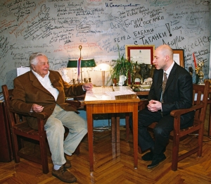 | Дмитрий Гордон беседует с Юрием Петровичем в его историческом кабинете на фоне знаменитой «музейной» стены, испещренной автографами выдающихся современников |