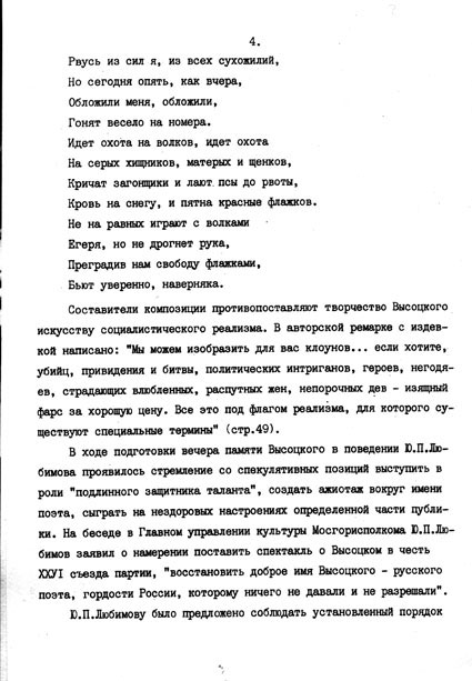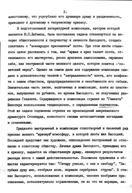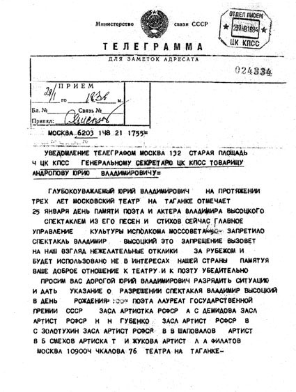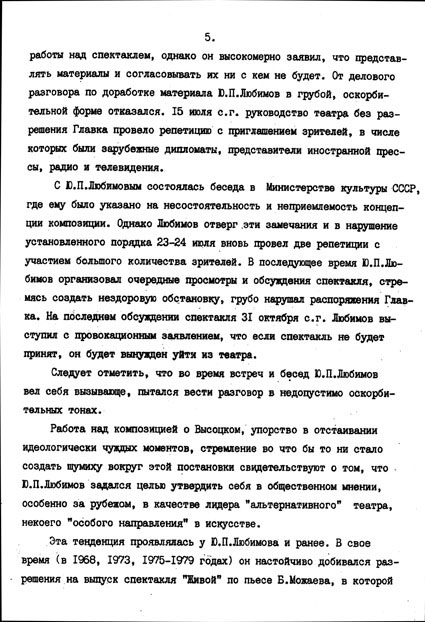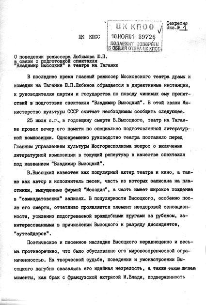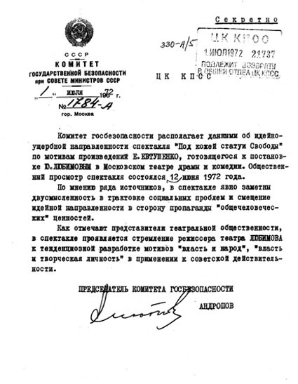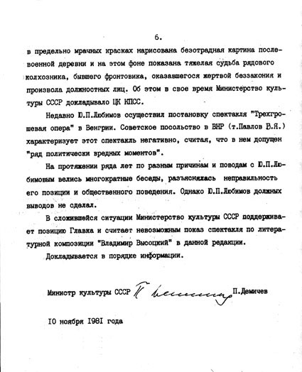 | Докладная («в порядке информации») министра культуры СССР Петра Демичева в ЦК КПСС, в которой рассматривается поведение режиссера Любимова, «задавшегося целью утвердить себя (особенно за рубежом) в качестве лидера альтернативного театра и некоего особого направления в искусстве» |