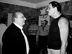 ![]() Михаил Жванецкий и Илья Олейников несут почетный караул у звездной гримерки Андрея Данилко |