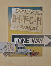 Или вот работа с более чем провокационным названием «Сука, учи английский!». Надоели все эти разговоры: «Друга державна, третя державна, десята державна...». Люди, мы должны выбрать свое место: либо в грузовике, который на картине, либо в той безумной машинке, которая, как муха, разбилась о стекло! И если кто-то не понимает, вот указатель с надписью, где грубо, но верно сказано: нужно догонять мир, от которого мы отстали, а не заниматься местечковой херней.