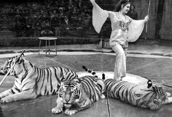Кем я у нее только не работал - делал все, что прикажут. Но как же я гордился, когда во время финального трюка на несколько минут входил вместе с ней в клетку! На манеж выбегали лошади, на одной из которых сидел тигр, на второй - лев, на третьей - медведь, а мы с ней стояли в центре. В такие минуты я чувствовал себя артистом.