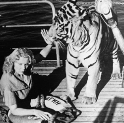 В это время умер и ее любимый тигр - Пурш. Он был ручной, как котенок. Правда, лентяем и тунеядцем тоже был знатным - ничего не делал, только снимался в кино, позировал фотографам и ходил на поводке с ней и Константиновским. В дрессуре есть такой закон: если хочешь сделать животное ручным, ты не должен его заставлять выполнять трюки. Вот и тигра нужно лелеять, надевать ошейник, терпеть его капризы и исполнять все прихоти, тогда он не будет выпускать когти.