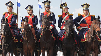 Да и не до дуэлей было защитникам Отечества: началось то самое Бородинское сражение, к годовщине которого, собственно, и снимали фильм. Правда, если верить режиссеру Олегу Фесенко, оно было не совсем таким, как пишут в учебниках по истории: больше напоминало ролевую игру, чем грандиозную решающую баталию, в ходе которой полегло ни много ни мало 58 тысяч человек. То, что миллион массовки ни на одну площадку не нагонишь и в мундиры не переоденешь, вполне понятно. Но ведь современные компьютерные технологии, слава Богу, позволяют дорисовать и миллион, и два, и сколько хочешь солдат, лошадей и орудий, если, конечно, захотеть. Да и бюджет картины - пять миллионов долларов - не такой уж скудный. Однако тратиться на дорисовку и доработку никто не стал, и теперь остается гадать, куда этот бюджет ушел, если в «бородинских» кадрах постоянно светятся только трое улан, юный Тарусов, страшный Кутузов, Наполеон, похожий на армянского продавца хурмы, и раненый уланский командир Троицкий, которого пускай недолго, но все же сыграл Алексей Макаров. Не постеснялся, так сказать.