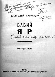 А книга далась Кузнецову большой кровью. Из эпилога к «Бабьему Яру»: «Этот роман я начинал писать в Киеве, в хате у матери. Но потом не смог продолжать и уехал: не мог спать. По ночам во сне я слышал крик: то я ложился и меня расстреливали в лицо, в грудь, в затылок, то стоял сбоку с тетрадкой в руках и ждал начала, а они не стреляли, у них был обеденный перерыв, они жгли из книг костер, качали какую-то пульпу, а я все ждал, когда же это произойдет, чтобы я мог добросовестно все записать. Этот кошмар преследовал меня, это был и не сон, и не явь, я вскакивал, слыша в ушах крик тысяч гибнущих людей».