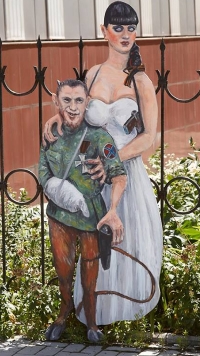 | Карикатура на командира противотанкового спецподразделения «ДНР» Моторолу (Арсения Павлова) с невестой. Свадьба гуляла под стенами Донецкой обладминистрации, где в это же время террористы пытали заложников |