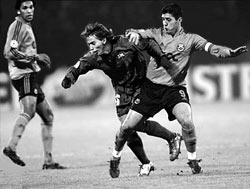 По-моему, Мирчи Луческу неважного мнения о скоростных данных главного действующего лица последней линии обороны "Барсы" Пуйоля, которого в духе принципов игры в линию никто не страхует в глубину. Иначе зачем было тренеру "Шахтера" давать установку форварду Агахове, обладающему редкостной стартовой скоростью, чтобы тот постоянно держался на такой близости от Пуйоля, словно собирается сдувать пылинки с капитана "Барселоны"? Конечно, это был заговор против новомодной манеры обороняться. Что подтверждает и позиция другого нападающего "Шахтера" - Брандао, который все время крутился на грани офсайда.