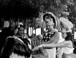 Молодых повели в специальное место, где совершался ритуал бракосочетания. Руководящий этой церемонией туземец произносил молитвы и заклинания, обращаясь к богам неба, земли, огня и воды. Стоящая рядом женщина переводила: "Вы должны быть вместе в горести и в печали, уважать мнение друг друга, подставлять плечо...". Затем Лиля и Тимофей получили новые, труднопроизносимые таитянские имена и услышали имена своих будущих детей: "Ваш сын - Камень-Океан - будет сильный и крепкий, как камень, а ваша дочь - Цветок-Солнце - будет красивая, как цветок и восходящее солнце".