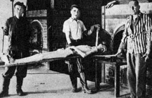 | Среди экспериментов Йозефа Менгеле, еще в 1935 году защитившего докторскую диссертацию на тему: «Расовые различия структуры нижней челюсти», были попытки изменить цвет глаз ребенка впрыскиванием химикатов в глаза, ампутация органов без анестезии, препарирование живьем, сшивание вместе близнецов и прочее. Оставшиеся после этих опытов в живых умерщвлялись |