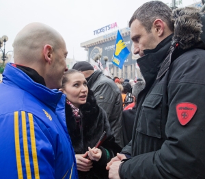 | Дмитрий Гордон, Алеся Бацман и Виталий Кличко. Майдан, декабрь 2013 года |