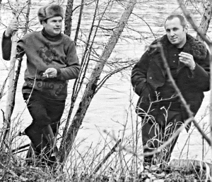 | Иван Лисняк (справа) с товарищем на отдыхе, БАМ, река Гилюй, май 1975 года |