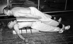 ![]() Андрей Старовойт (снизу), лежа под гвоздями на саблях, обезболили себя концентрацией энергии |
