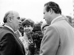 ![]() Виктор Макаренко (справа) с Михал Сергеичем и Раисой Максимовной, которая всегда принимала активное участие в разговорах на высшем уровне |