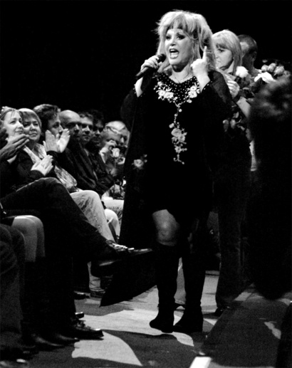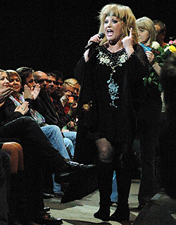 Она большая актриса. Это не новость. Даже в ее вечном сценическом обмане никогда не будет снисходительности к публике. И никогда вы не прочтете в ее глазах ницшевское "я пробегаю над вами, как взгляд над грязью". Поскольку в этих глазах (притворно или искренне, неважно) - просьба о понимании... Немолодая я уж, тяжело мне, не судите строго... В этой программе возникнет и второй условный блок, когда она уже вернется из "ада" и напомнит несведущим, что этот мир придуман не нами, так и нечего хныкать - будем веселиться, петь, зажигать!