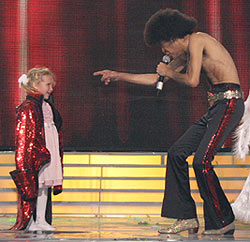Потом на сцену выпорхнуло чадо лет четырех и трехлетняя кроха. Фаррелл резко стянул с себя расшитый блестками малиновый сюртук и набросил на старшую девочку. Ребенок прогнулся под тяжестью одежки, а певец резвее задвигал полуобнаженным телом.