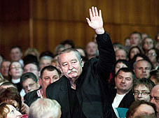 Открывал вечер виновник торжества - песней «Вот и здравствуй», подаренной еще одним другом - российским шансонье Евгением Кемеровским. И сразу попал под обстрел «квартальных». «Наверное, никто в этом зале не сомневается, что Дмитрий Ильич занимает достойное место среди таких выдающихся певцов, как Михаил Поплавский, Ассия Ахат, Ирина Круг», - начал перечислять Зеленский, а Кошевой задал Гордону вопрос, который давно мечтал задать: «Ну скажите, зачем вы пошли на эстраду?». - «Чтобы у Михал Михалыча Поплавского появился конкурент», - улыбнулся наш главный редактор. Кстати, на концерте был и поющий ректор - правда, в качестве зрителя.