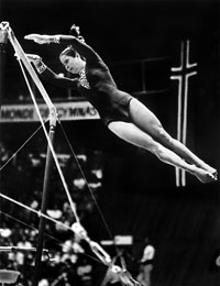 - Да! Трос отскочил, и конструкция подо мной зашевелилась. В конце упражнения, когда выполнить осталось несколько элементов, чувствую: что-то с брусьями происходит неладное. "Что же делать?" - мелькнула мысль. Но в голове заложена программа - ты работаешь, как автомат, и понимаешь: нужно все довести до конца и соскочить с брусьев. Слава Богу, я это сделать успела. Исполнила оборот на нижней жерди, усилием мышц живота оттолкнулась от брусьев и сделала так называемый срыв. Выполняя этот элемент, я, наверное, отбросила брусья назад, а сама вылетела слегка вперед. При этом, поскольку натяжение было уже недостаточным, не смогла выполнить запланированный поворот на 360 градусов, просто сделала, как мы говорим, прямой соскок... Конечно, зал ахнул. Я почувствовала, что брусья падают, но даже не оглянулась - у меня же впереди оценка! Я не вправе была подвести ни себя, ни Советский Союз...