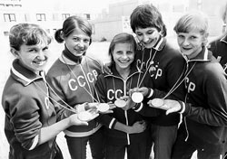 ![]() Красавицы, умницы, чемпионки... Вторая слева - Людмила Турищева, в центре - Ольга Корбут |