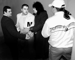 ![]() Бизнесмен Дмитрий Чалый (в центре) решил разобраться с Фаготом (крайний справа), как мужчина с мужчиной. Первым, кто бросился их разнимать, был Иво Бобул |
