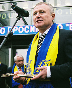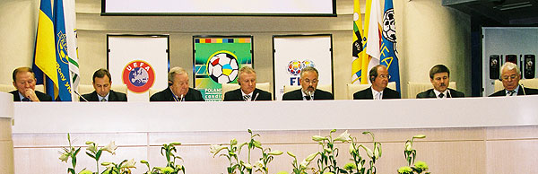 ![]() Только любовь к футболу может объединить непримиримых, казалось бы, политических противников. Слева направо: Леонид Кучма, Николай Томенко, Леннарт Йоханссон, Григорий Суркис, Дмитрий Табачник, генеральный секретарь ФИФА Урс Линси, Олег Васюник, Леонид Кравчук |