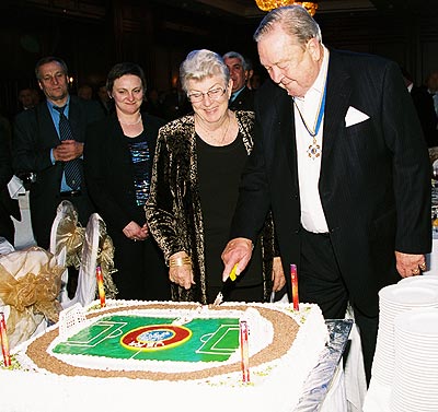 ![]() Президент УЕФА Леннарт Йоханссон, отметивший в начале января 77-летие, получил от Президента Ющенко Орден Ярослава Мудрого III степени, а от Украинской федерации футбола - именинный торт. Первой этим шедевром кулинарного искусства полакомилась супруга господина Йоханссона |