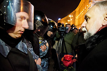 | Юрий Анатольевич беседует с бойцом «Беркута» во время очередной годовщины «оранжевой революции», 2012 год Фото УНИАН |