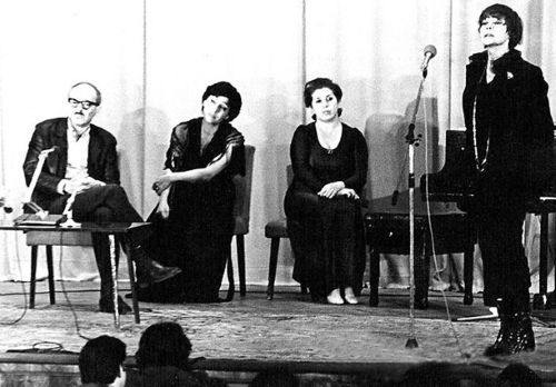 | Нани Брегвадзе (вторая слева) с Булатом Окуджавой и Беллой Ахмадулиной, начало 80-х годов. «Мне публика помогает: на сцене беру себя в руки, голова хорошо включается, и что-то такое идет, чего в четырех стенах комнаты никогда не получится» |