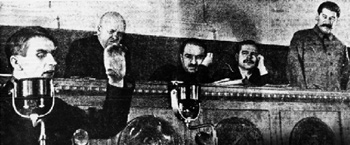 | Станислав Косиор, Анастас Микоян, Андрей Андреев и Иосиф Сталин слушают речь академика Лысенко на совещании передовиков урожайности по зерну, трактористов и механизаторов, Кремль, 1935 год |
