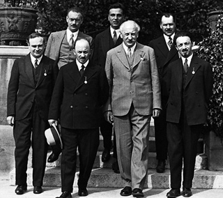 | Второй слева — Николай Бухарин (уже выведенный из ЦК Политбюро ВКП (б)), рядом с ним справа — отец советской физики академик Абрам Иоффе, крайний справа во втором ряду — Николай Вавилов и другие во время научной конференции в Лондоне, 1931 год |