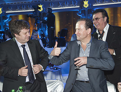| Лучший футболист СССР 1986 года Александр Заваров, обладатель «Золотого мяча» 1986 года Игорь Беланов и народный артист Украины Виталий Билоножко Фото Феликса РОЗЕНШТЕЙНА |