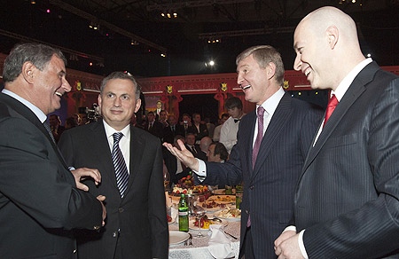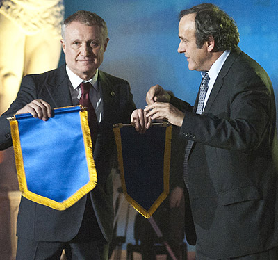 | Президент УЕФА Мишель Платини поздравляет президента Федерации футбола Украины Григория Суркиса: «Когда отмечаешь 20-й день рождения, обычно говоришь о будущем, однако будущее Украины берет истоки из ее славного прошлого...» Фото Феликса РОЗЕНШТЕЙНА |