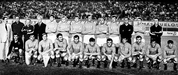 | Сборная СССР перед игрой с командой Перу, 1969 год. В первом ряду — Евгений Рудаков, Муртаз Хурцилава, Альберт Шестернев, Каха Асатиани, Виктор Серебрянников, Михаил Гершкович, Гиви Нодия, Владимир Мунтян, Анатолий Бышовец, Реваз Дзодзуашвили, Евгений Ловчев. Во втором ряду: третий слева — врач Олег Белаковский, дальше — старший тренер Гавриил Качалин, Валентин Афонин, Николай Киселев, Виктор Папаев, Геннадий Логофет, Анатолий Пузач, Владимир Капличный, Анзор Кавазашвили, Виталий Хмельницкий, Алексей Парамонов |