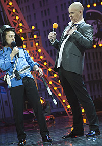 Плачущую и стонущую публику пытался привести в чувства Валерий Жидков - как всегда, с приветом от авторского цеха «Квартала-95». Но потом махнул рукой, констатируя: «Новый год - чисто наш праздник, ни у кого такого нет. То, что они там, на Западе, отмечают, - полная чушь: какой-то Санта-Клаус на каких-то оленях через какую-то трубу... Вот наш Дед Мороз настоящий. Его можно потрогать, с ним можно выпить, после его ухода в доме могут пропасть вещи... Он живой, реальный! Поэтому в Деда Мороза у нас верят все, даже президенты. Вот чего они каждый год говорят: «Все будет лучше, пенсии и зарплаты поднимутся»? Вы думаете, это они обещают? Нет, желания загадывают! Так что празднуйте на здоровье...».