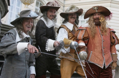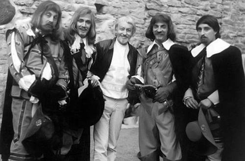 | Портос (Валентин Смирнитский), Арамис (Игорь Старыгин), д`Артаньян (Михаил Боярский) и Атос (Вениамин Смехов) с режиссером культового фильма «Д`Артаньян и три мушкетера» Георгием Юнгвальдом-Хилькевичем, 1979 год |