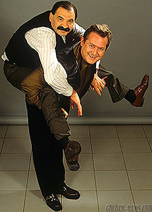 | В роли Кисы Воробьянинова с Юрием Гальцевым (отец Федор) в телемюзикле «12 стульев», 2005 год |